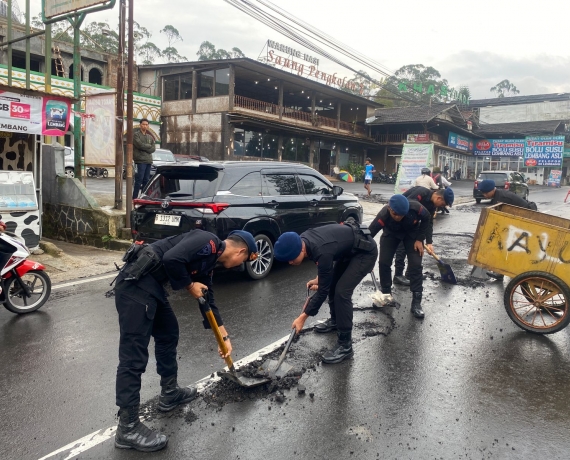 BANDUNG - Personel Batalyon B Pelopor Satuan Brimob Polda Jawa Barat melaksanakan aksi cepat tanggap dengan membersihkan material pasir dan kerikil sisa aspal yang rusak akibat arus air deras setelah diguyur hujan lebat di kawasan Cikole, Lembang, khususnya di Jalan Raya Tangkuban Perahu, Selasa (30/9/2025).