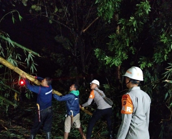 SUMEDANG - Hujan deras dari sore yang melanda wilayah Kecamatan Tanjungkerta, Kabupaten Sumedang, mengakibatkan banyak pohon bambu tumbang dan menutupi badan jalan di Desa Cipanas. Akibat kejadian tersebut, arus lalu lintas di lokasi sempat terhenti total karena kendaraan tidak dapat melintas, Sabtu (1/11/2025).